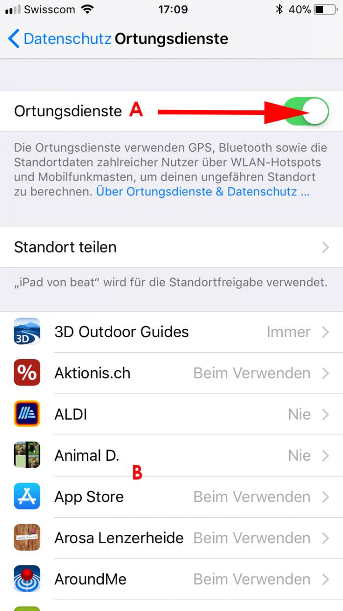 Stellen Sie den Schalter bei Ordnungsdienste (A) auf «Ein». Um die Rechte einer App genau zu definieren, suchen Sie untern (B) die App und tippen darauf.