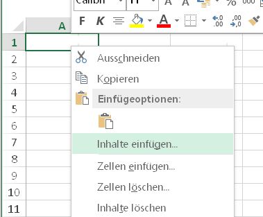 Klicken Sie im neuen Arbeitsblatt in die Zelle A1 und rufen Sie mit einem Klick mit der rechten Maustaste das Kontextmenü auf. Klicken Sie mit der linken Maustaste auf «Inhalte einfügen...»