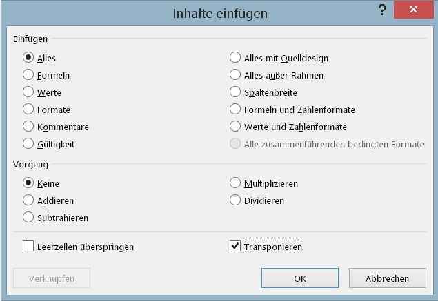 Aktivieren Sie das Kontrollkästchen neben «Transponieren» unten rechts im Fenster «Inhalte einfügen» und klicken Sie auf «OK».