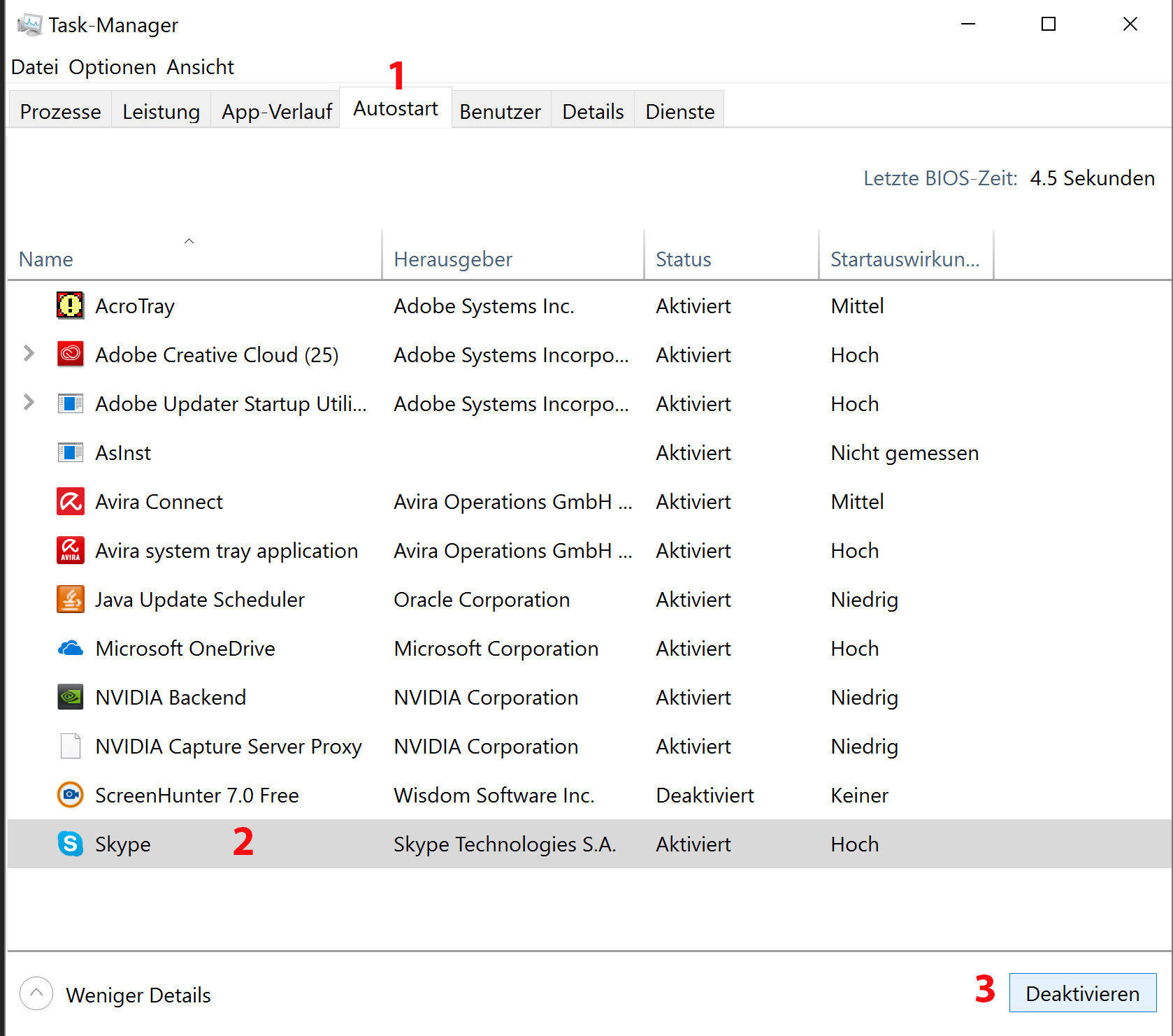 Wählen Sie im Fenster «Task-Manager» den Reiter «Autostart» (1), klicken Sie auf das Programm, das Sie deaktivieren möchten (2) und dann auf die Schaltfläche «Deaktivieren» (3).