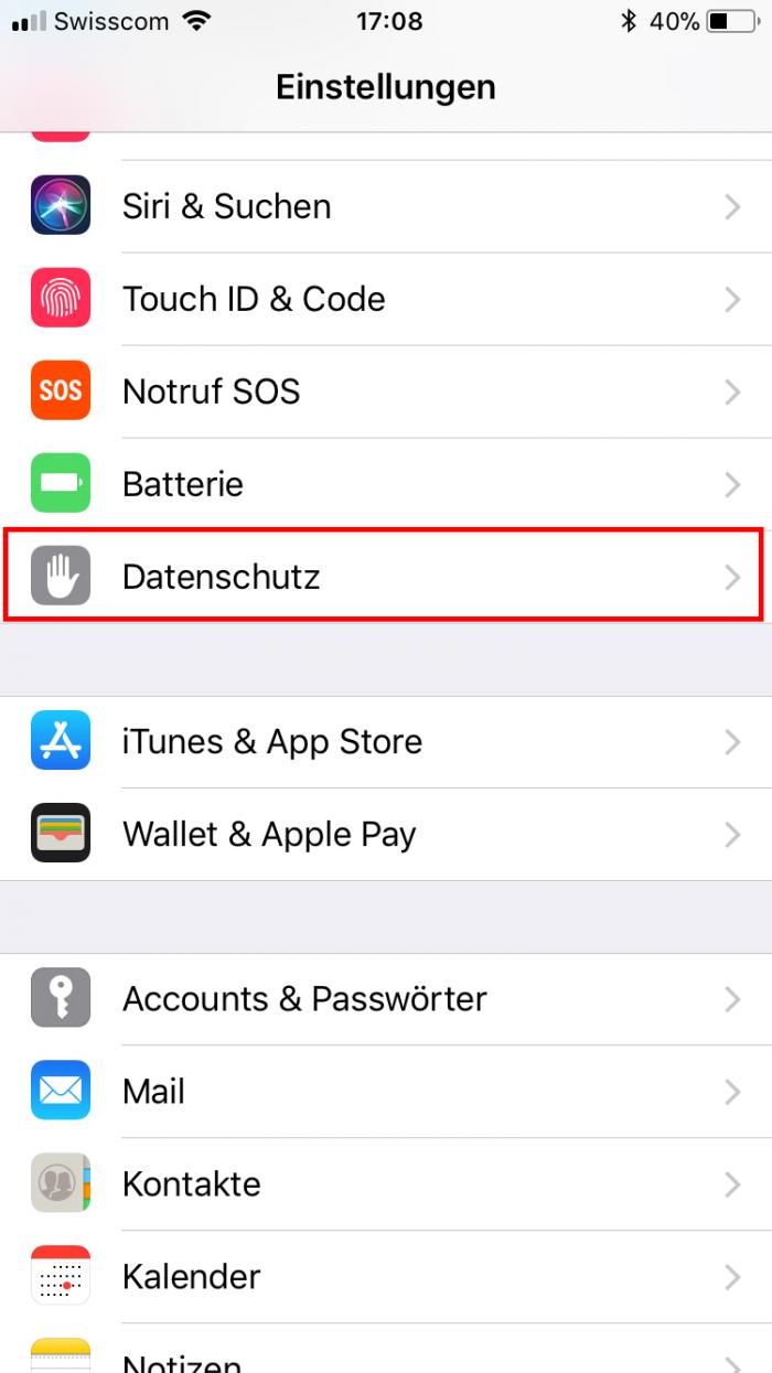 Herunterscrollen und den Eintrag «Datenschutz» antippen.
