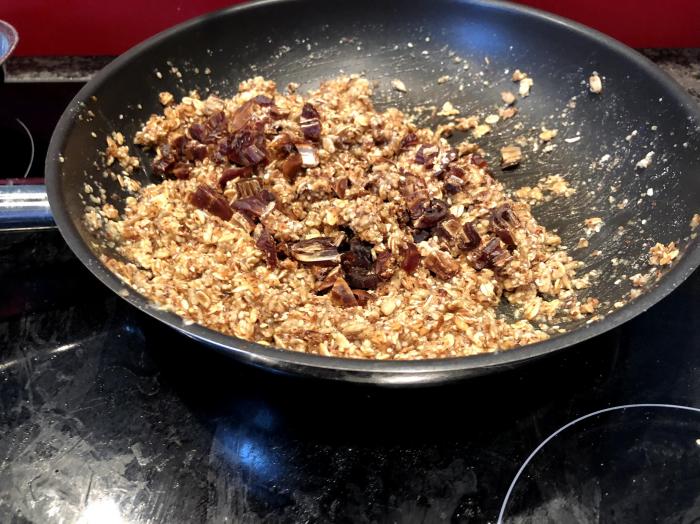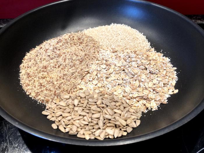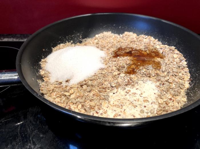 Haferflocken, Nüsse, Sesamsamen und Sonnenblumenkerne in einer Pfanne bei mittlerer Hitze rösten.