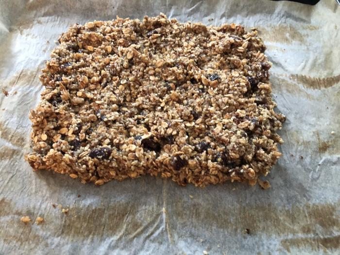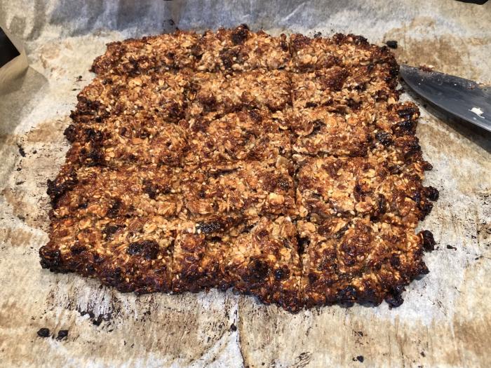 Die noch warme Masse auf dem Blech in Riegel-Form schneiden und auskühlen lassen.