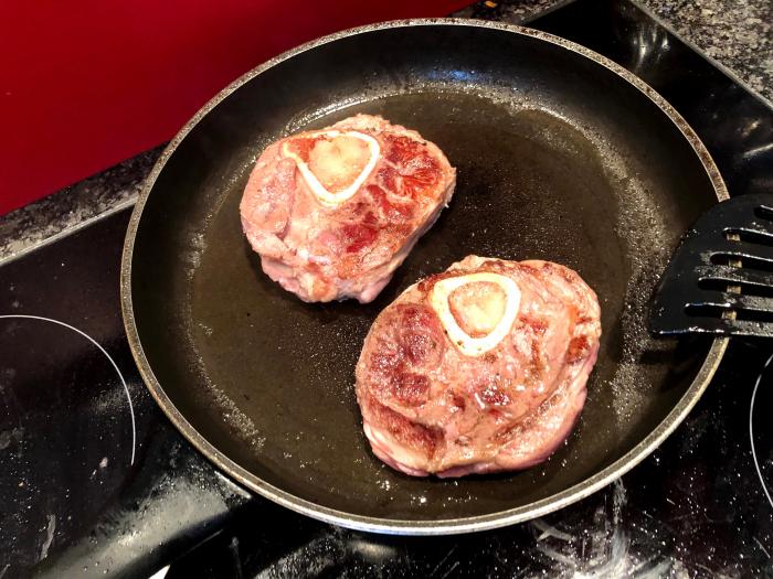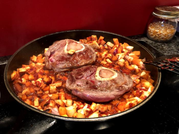 Rindshaxen zurück in die Pfanne geben. Pfanne mit einem grossen Deckel bedecken und während rund 90 Minuten köcheln lassen.