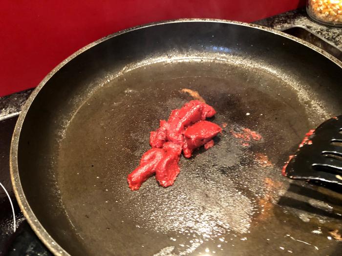 Fleisch beiseite stellen und dann Tomatenmark in der heissen Pfanne etwas drei Minuten rösten.
