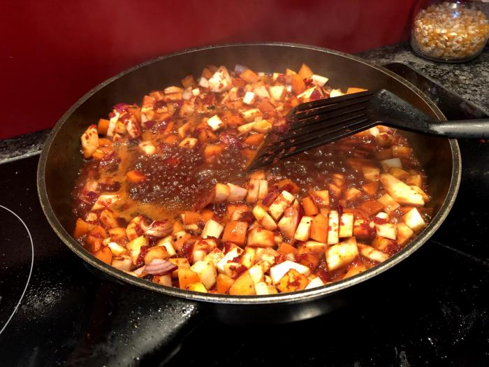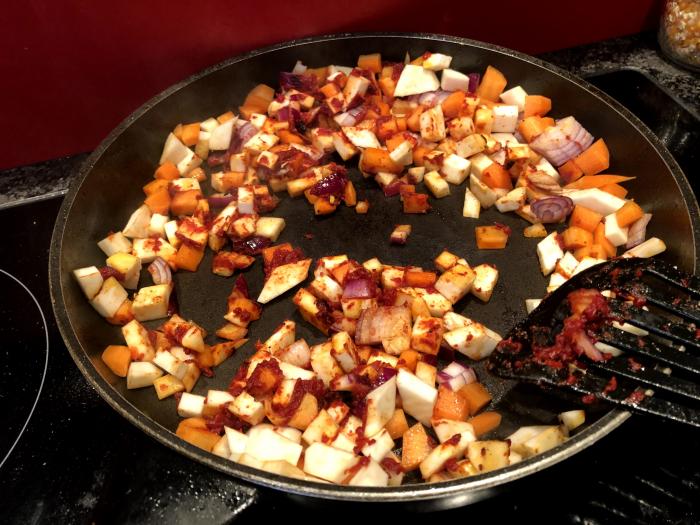 Gemüse beigeben und ebenfalls etwas drei Minuten unter Rührer mit dem Tomatenmark vermischen.