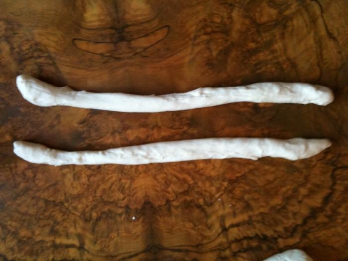 Rollen Sie beide Portionen zu gleich langen Strängen.