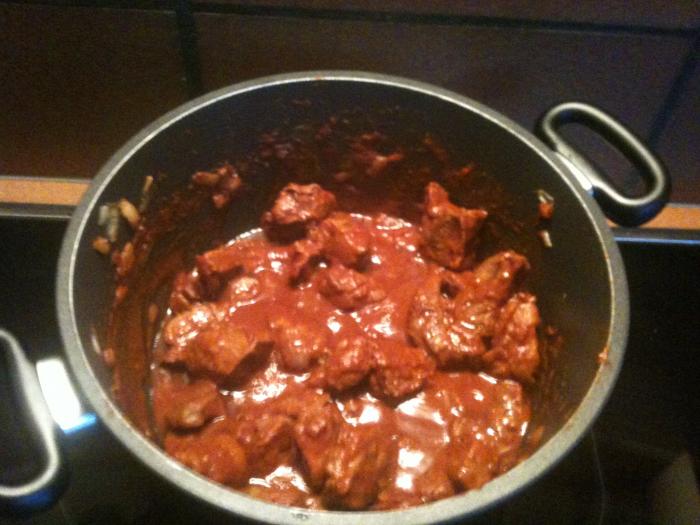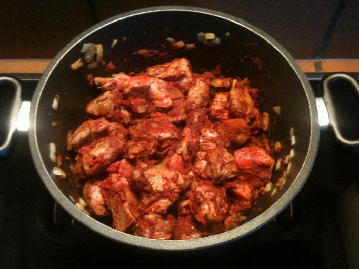 Fleisch, Tomatenmark und Paprika zugeben und umrühren.
