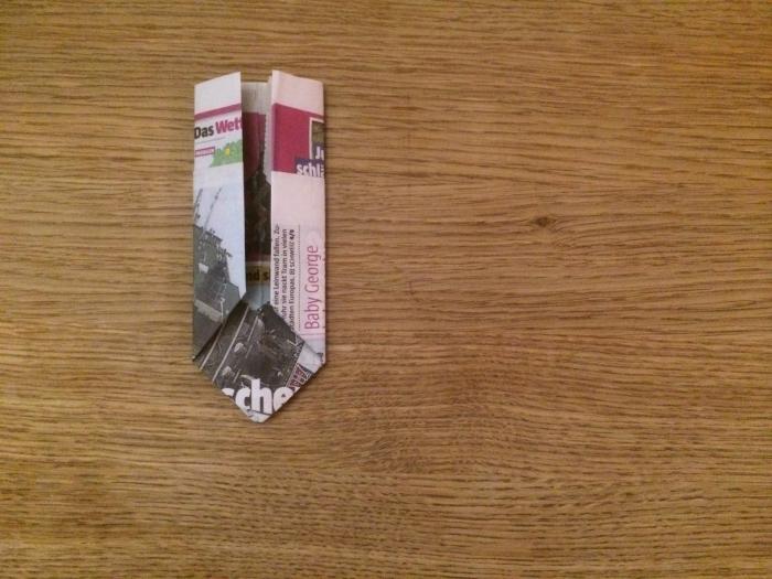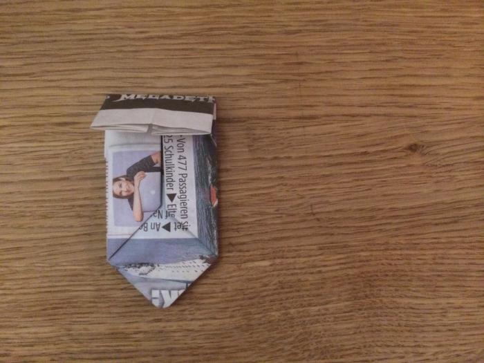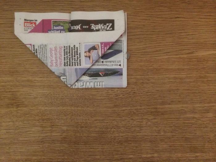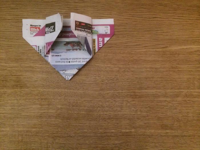 Blatt wieder auffalten. Linke untere Ecke zwischen die Seiten in die Mitte falten.