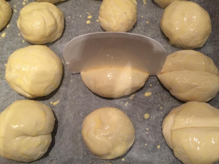Mit einem Spachtel Teigkugeln in der Hälfte eindrücken für die typische Weggli-Form.